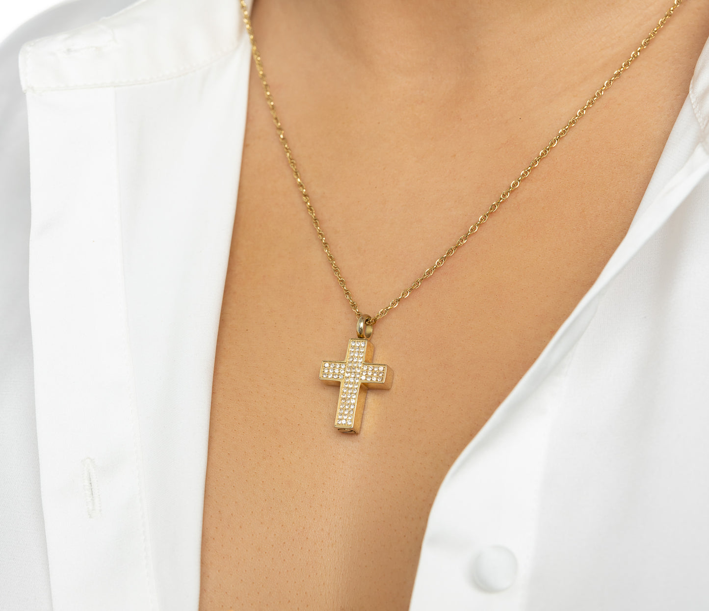 Ce pendentif en forme de croix, symbole de foi et de réconfort, est soigneusement fabriqué en acier inoxydable et entièrement orné de petits zircons scintillants. Il contient une cavité discrète permettant d’y conserver une petite quantité de cendres ou un souvenir précieux. Un bijou lumineux et significatif pour honorer la mémoire d’un être cher avec élégance et spiritualité.