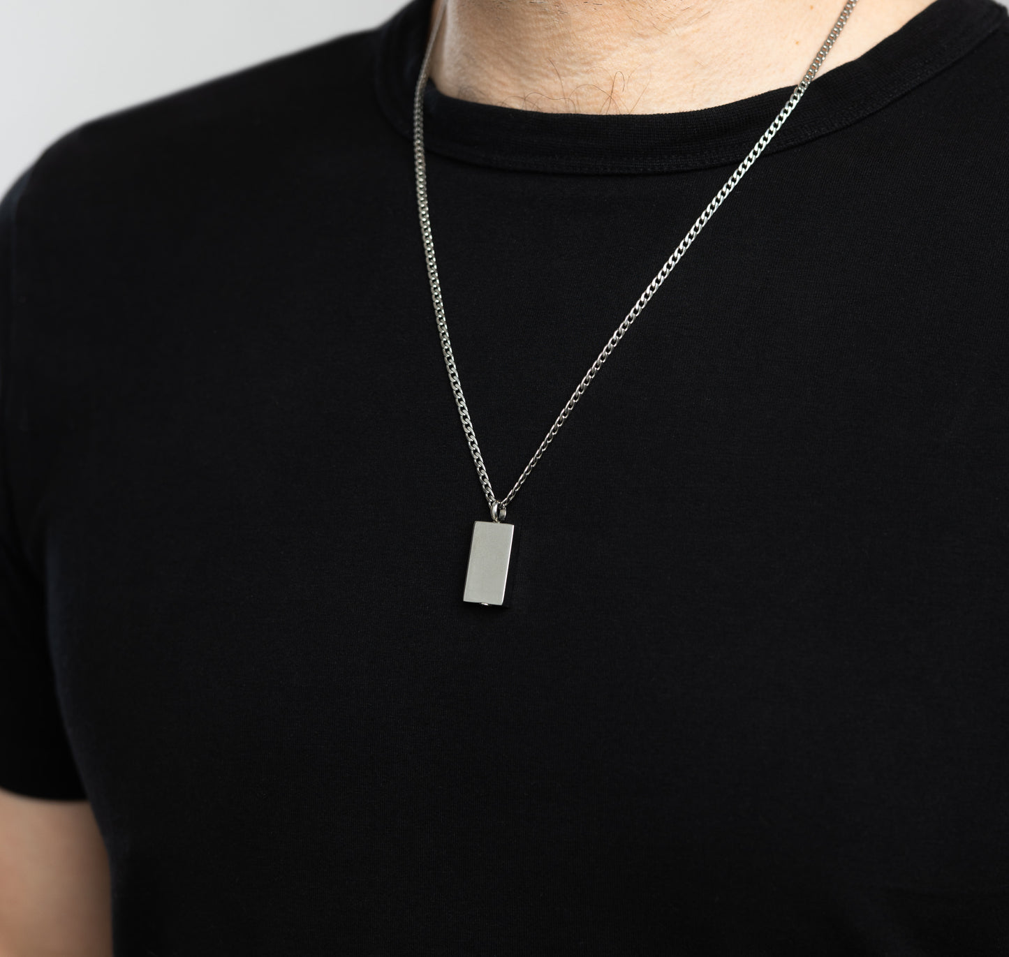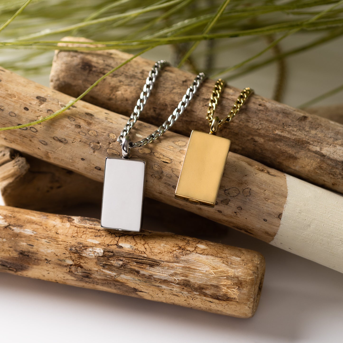 Ce pendentif au design épuré et moderne, en forme de plaque rectangle, convient aussi bien aux hommes qu’aux femmes. Fabriqué en acier inoxydable durable, il intègre une petite cavité discrète pour conserver une quantité symbolique de cendres ou un souvenir précieux. Un bijou minimaliste et élégant, parfait pour garder la mémoire d’un être cher près du cœur.
